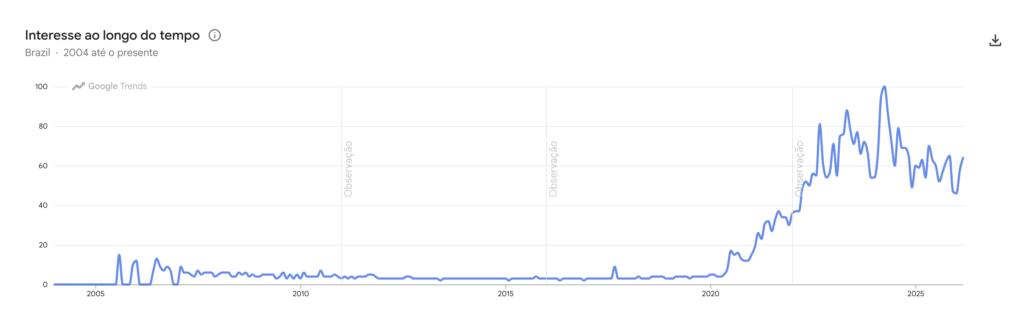 No gráfico acima, extraído do Google Trends, vemos que o termo ESG teve dois momentos de pico nas buscas do site: em 2004, quando foi lançado o documento Who Cares Wins, e a partir de 2019, quando a pandemia da COVID-19 impulsionou novamente os temas de responsabilidade empresarial.